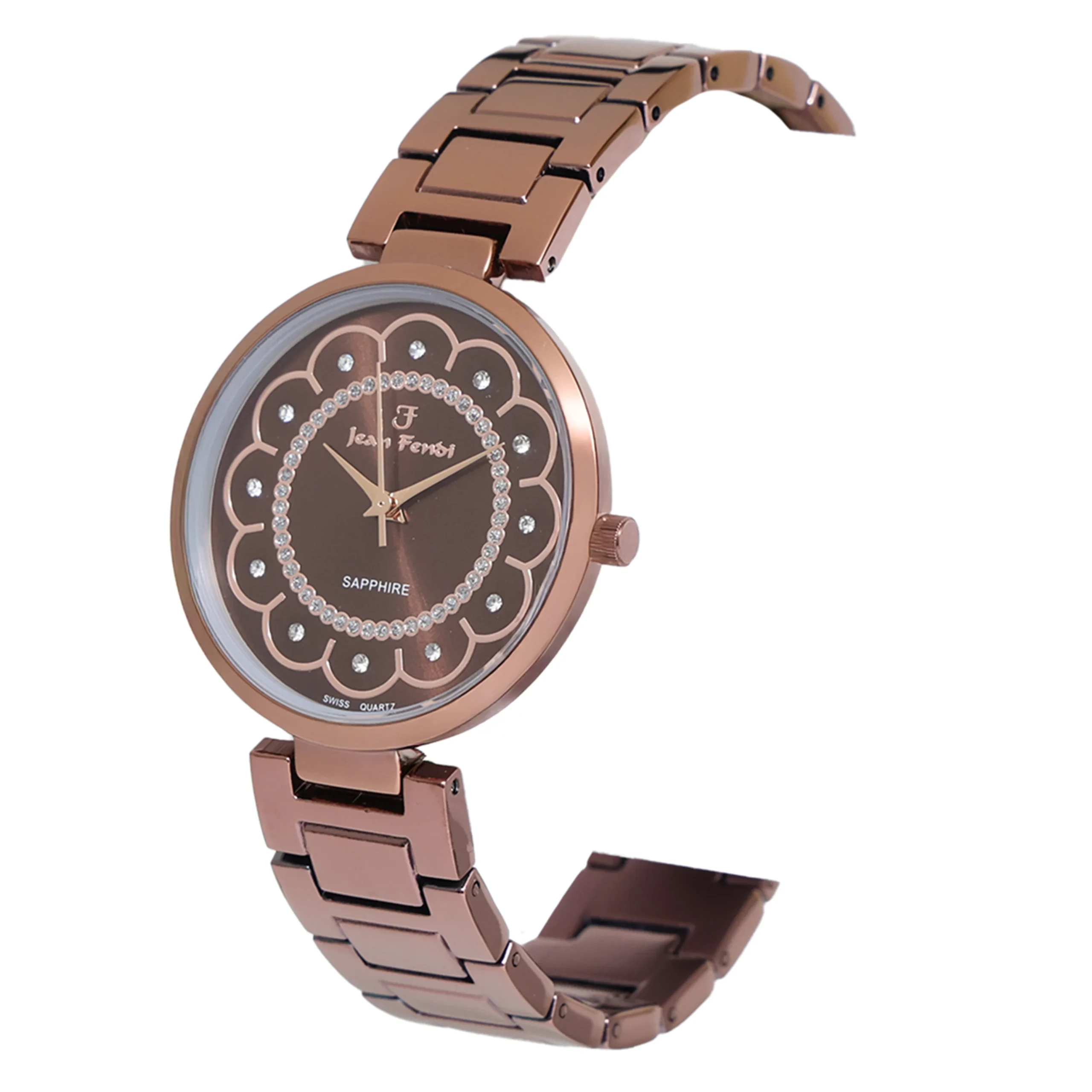 The Jean Fendi Brown Dial Crystal Rose-Gold Ladies’ Watch is designed for women who want to make a bold yet elegant fashion statement. Its deep brown sunray dial, surrounded by a crystal-studded floral-inspired design, radiates luxury and charm. Paired with a full rose-gold brown stainless steel bracelet, this timepiece is the perfect balance of elegance and modern glamour. With sapphire crystal protection and Swiss quartz precision, it offers both beauty and reliability.