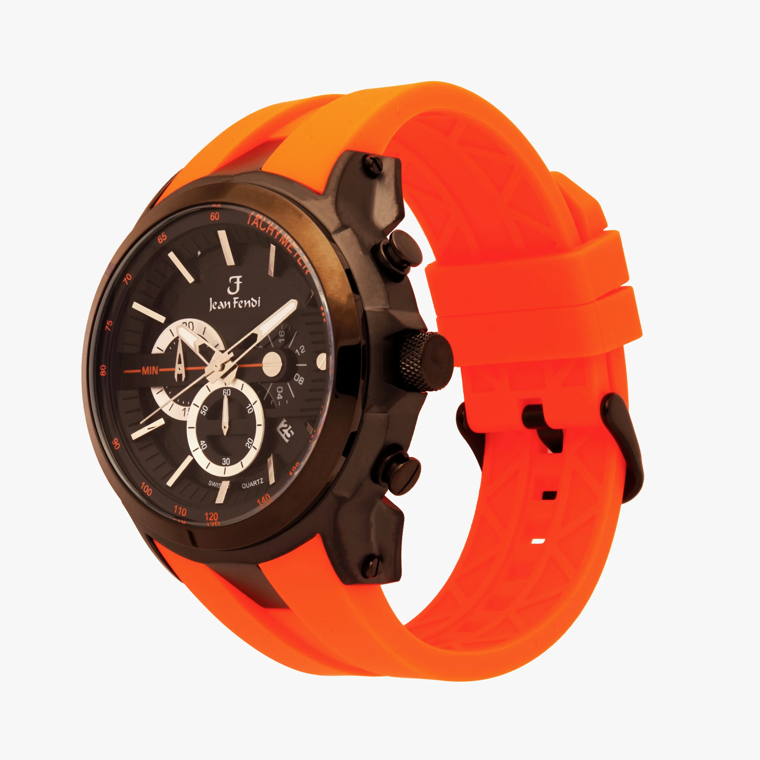 The Jean Fendi ChronoSport Orange Edition is a vibrant, high-performance timepiece designed for men who live life in the fast lane. Featuring an eye-catching orange silicone strap, a rugged gunmetal-tone stainless steel case, and a bold black dial with white and orange chronograph details, this watch delivers both sportiness and luxury. Swiss quartz precision and a tachymeter bezel make it as functional as it is stylish.