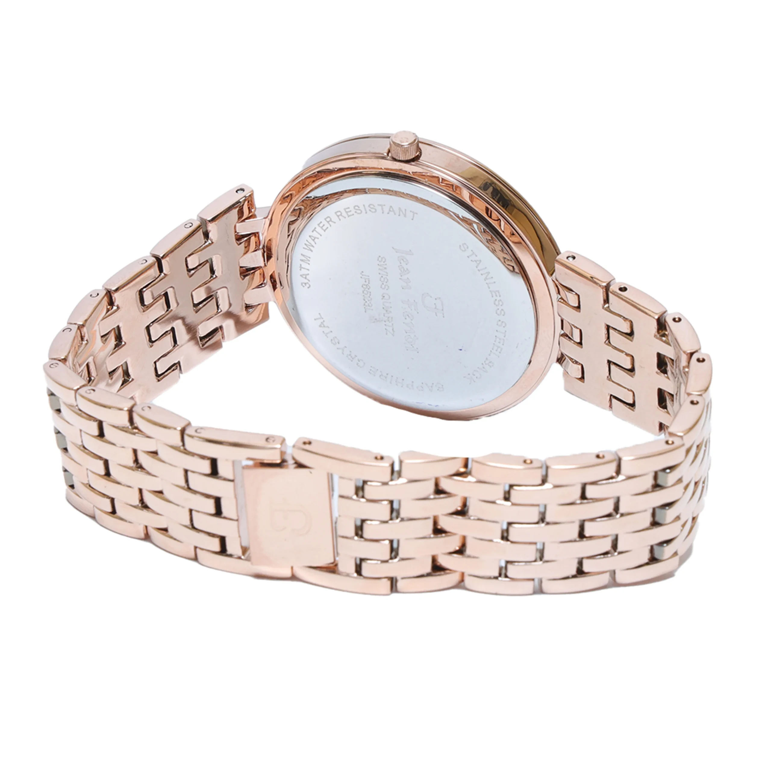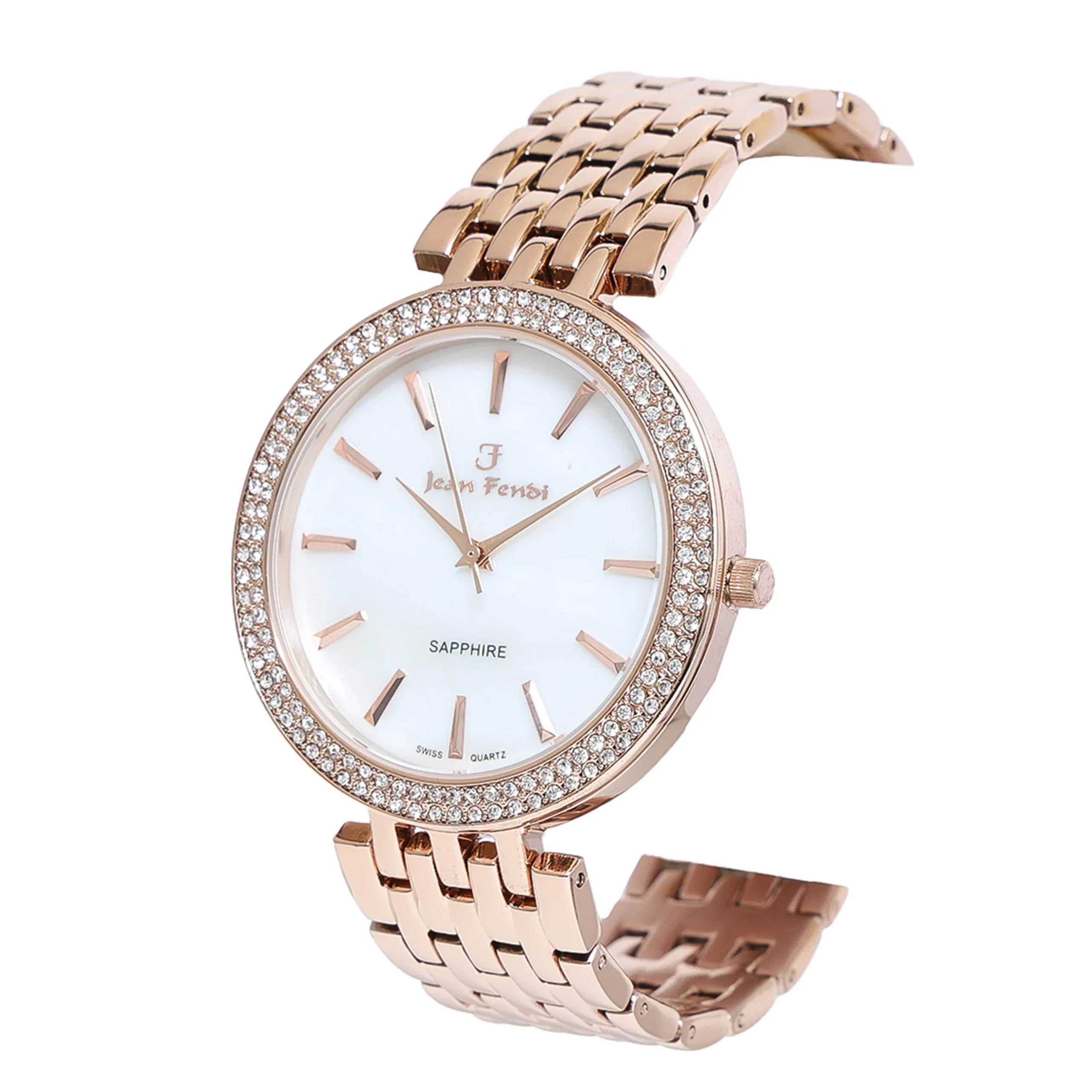The Jean Fendi Crystal Bezel Rose-Gold Ladies’ Watch is crafted for women who adore understated luxury. Featuring a radiant white dial with rose-gold stick indices, surrounded by a fully encrusted crystal bezel, this timepiece brings together glamour and refinement. The polished rose-gold bracelet adds sophistication, while the sapphire glass ensures durability against daily wear. Powered by precise Swiss quartz movement, it’s the perfect companion for both elegant evenings and everyday chic looks.