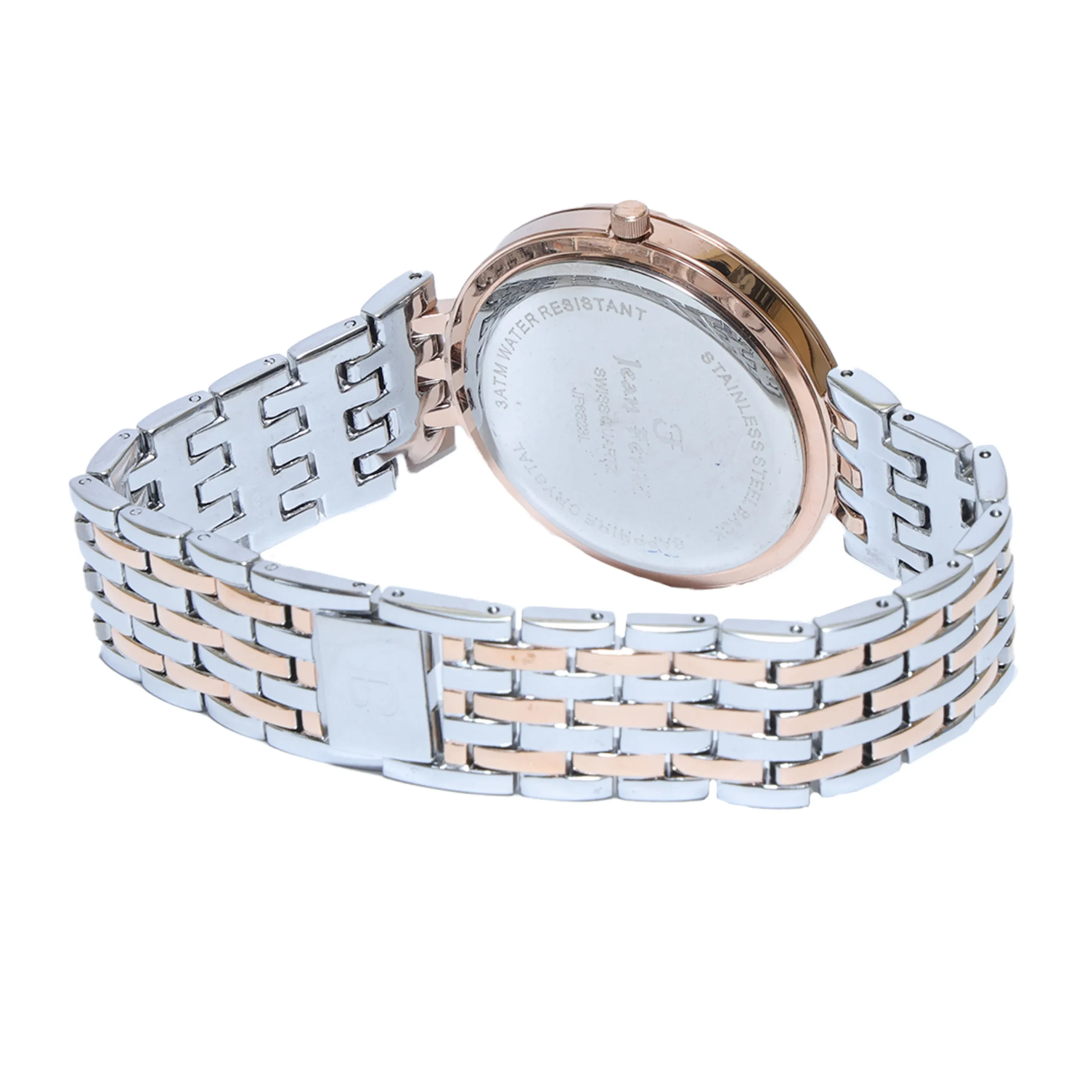 Material: Stainless steel with rose-gold plating Diameter: Approx. 34mm Bezel: Crystal-studded for added sparkle Water Resistance: 3 ATM