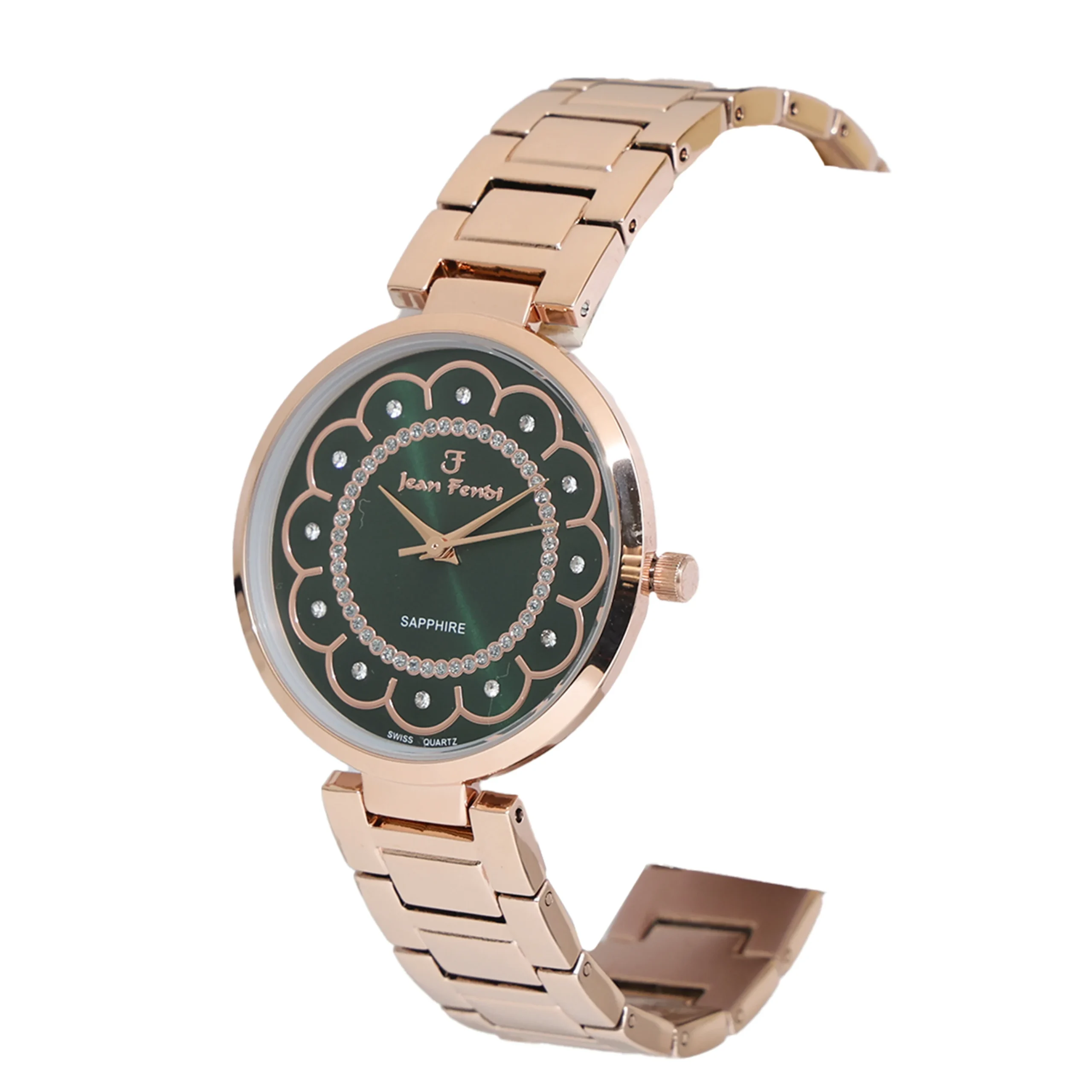 The Jean Fendi Emerald Bloom Ladies’ Watch is a fusion of artistry and luxury. With a rich emerald-green dial framed by a floral-inspired motif, this timepiece is adorned with a sparkling inner circle of crystals. Paired with a rose-gold bracelet, it radiates femininity, grace, and timeless glamour. Designed for women who love jewelry-like watches that double as elegant accessories.