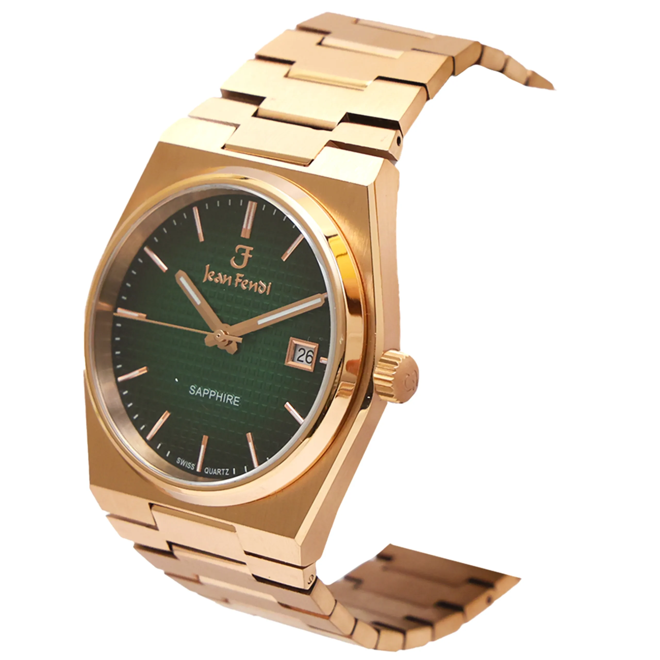A bold statement piece from the Jean Fendi Sapphire Collection, this watch features a striking emerald green textured dial set within a polished gold-tone case and bracelet. Designed with Swiss precision and sapphire crystal protection, it blends elegance with durability. The slim indices, luminous hands, and date display at 3 o’clock make it as practical as it is stylish. Perfect for collectors and those who prefer a touch of luxury in their everyday wear.