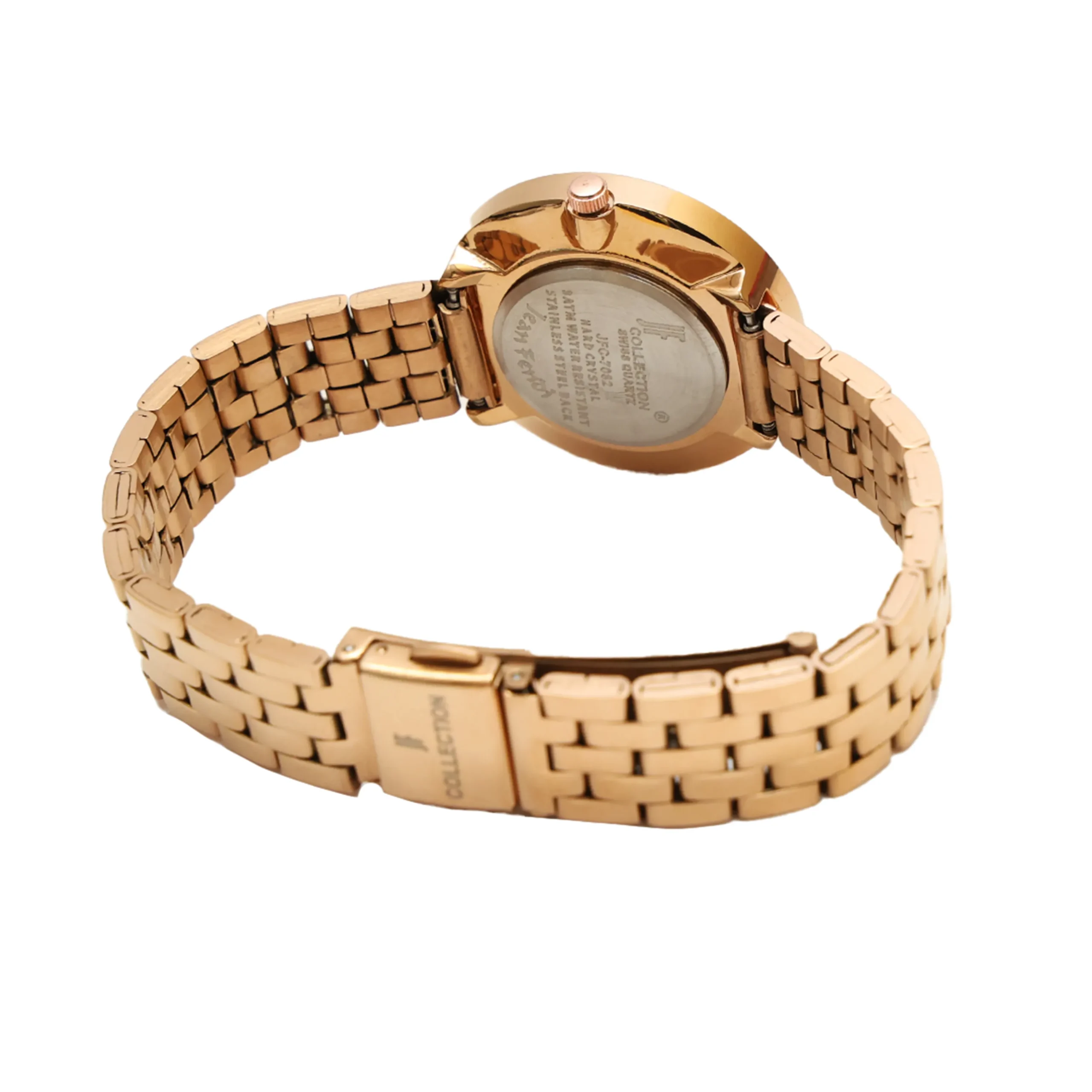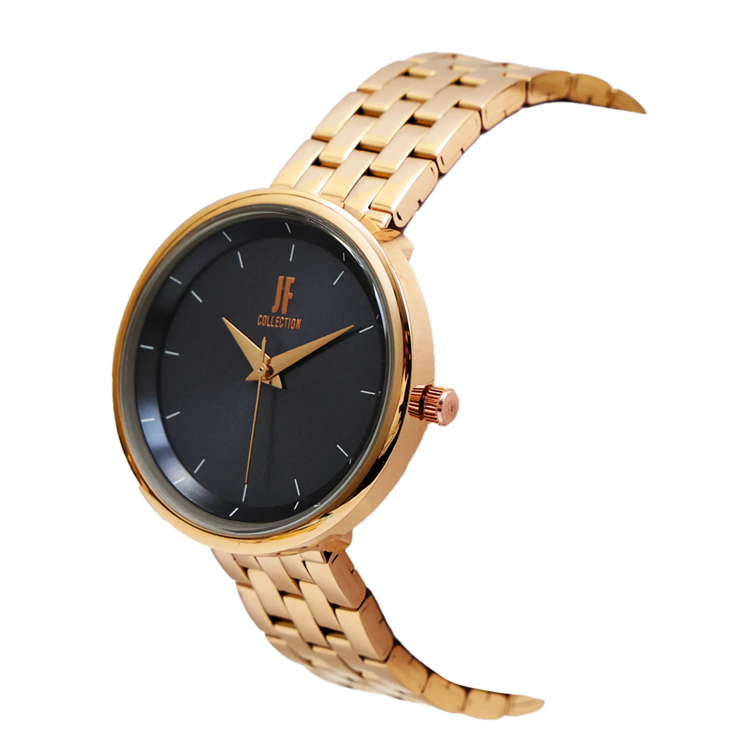 Dial Color: Matte Black Markers: Slim White Stick Indices Hands: Rose Gold-Tone (Hour, Minute, Seconds) Branding: JF Collection Logo at 12 o’clock Glass: Hardened Mineral Crystal