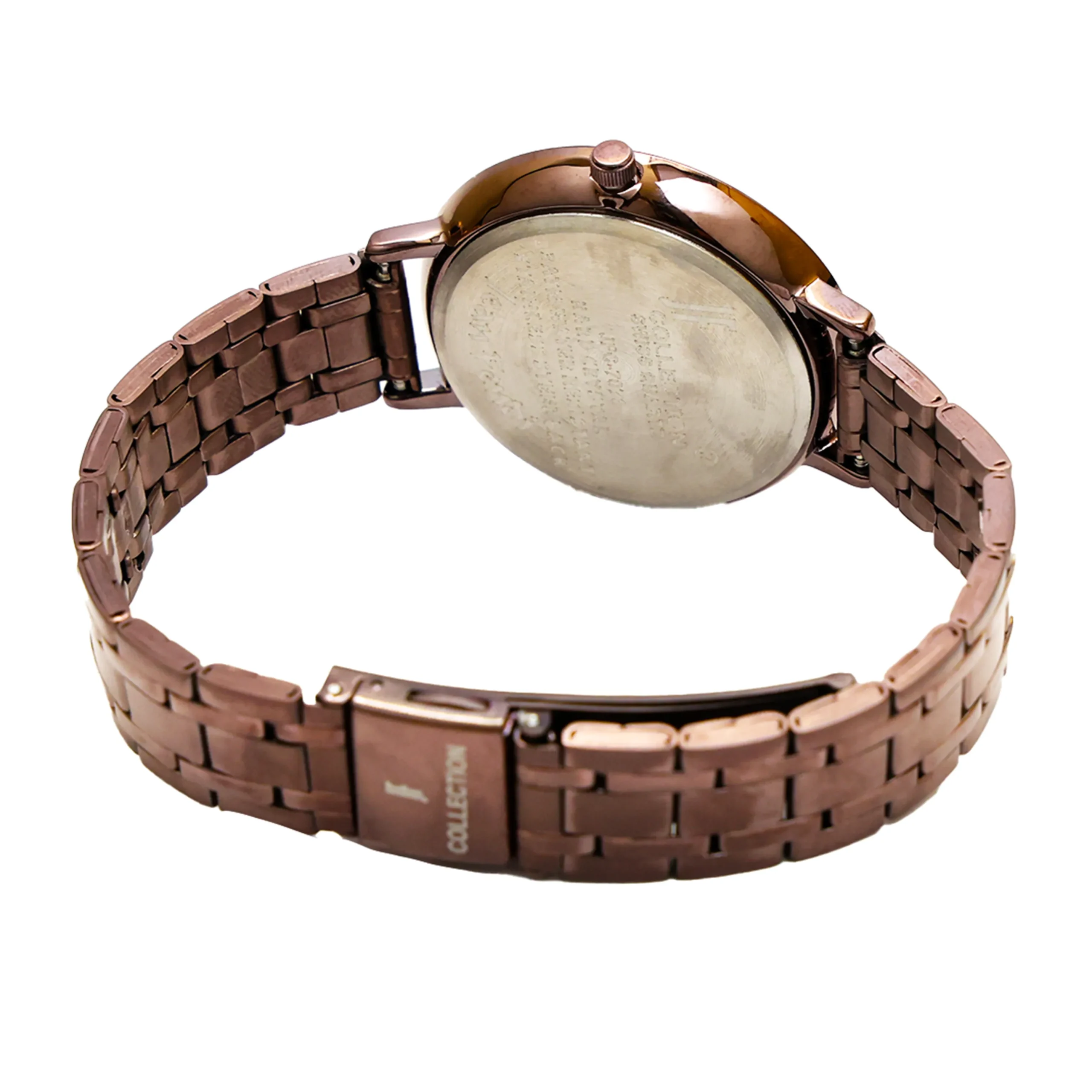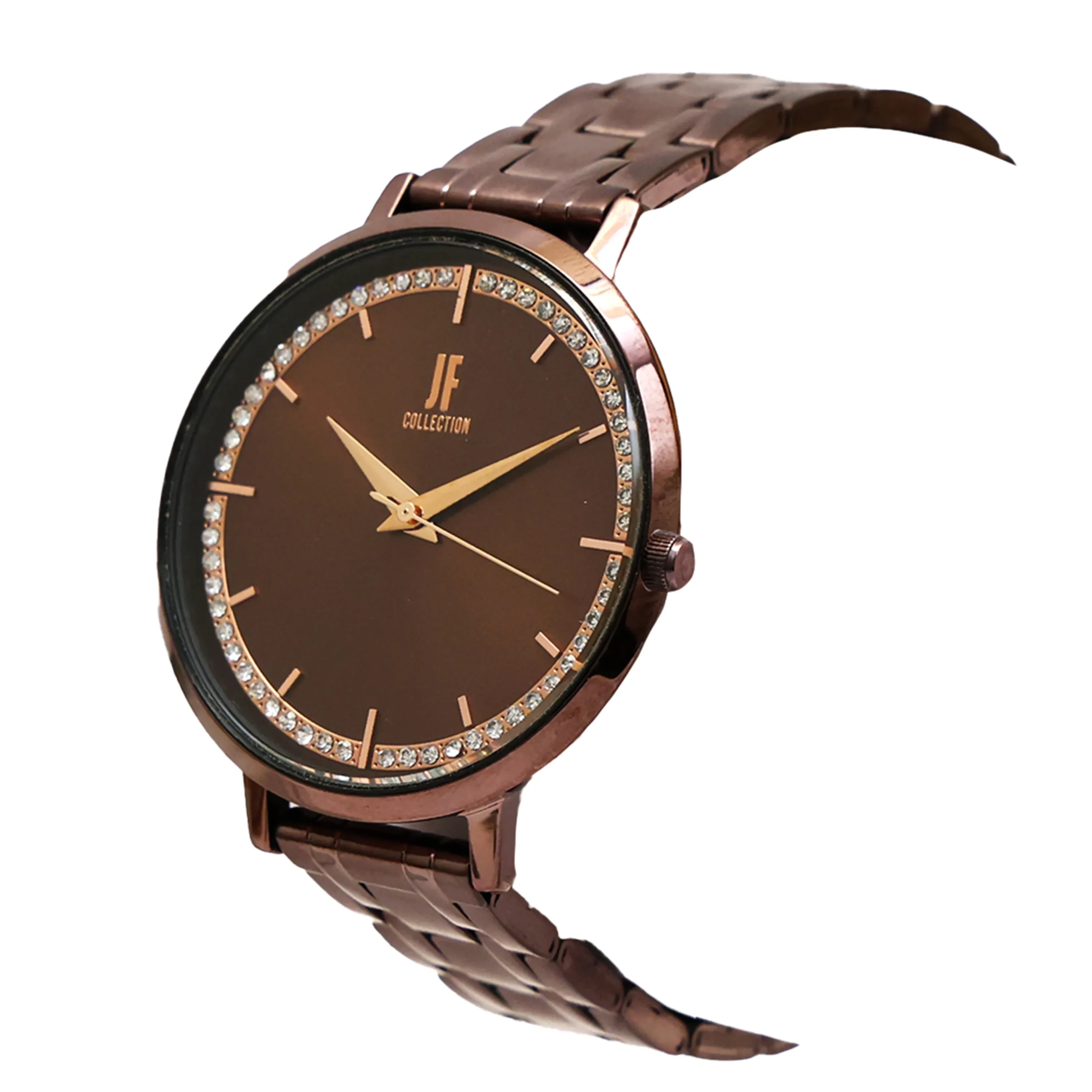 Dial Color: Rich Chocolate Brown Dial Finish: Smooth matte finish Hour Markers: Rose gold-tone applied stick indices at 3, 6, 9, and 12 o’clock Crystal Accents: Premium crystal stones positioned at quarter hour markers Hands: Rose gold-tone stick hands (hour, minute, seconds) Brand Logo: “JF COLLECTION” printed in rose gold at 12 o’clock Sub-markings: Minimalist minute track around dial perimeter