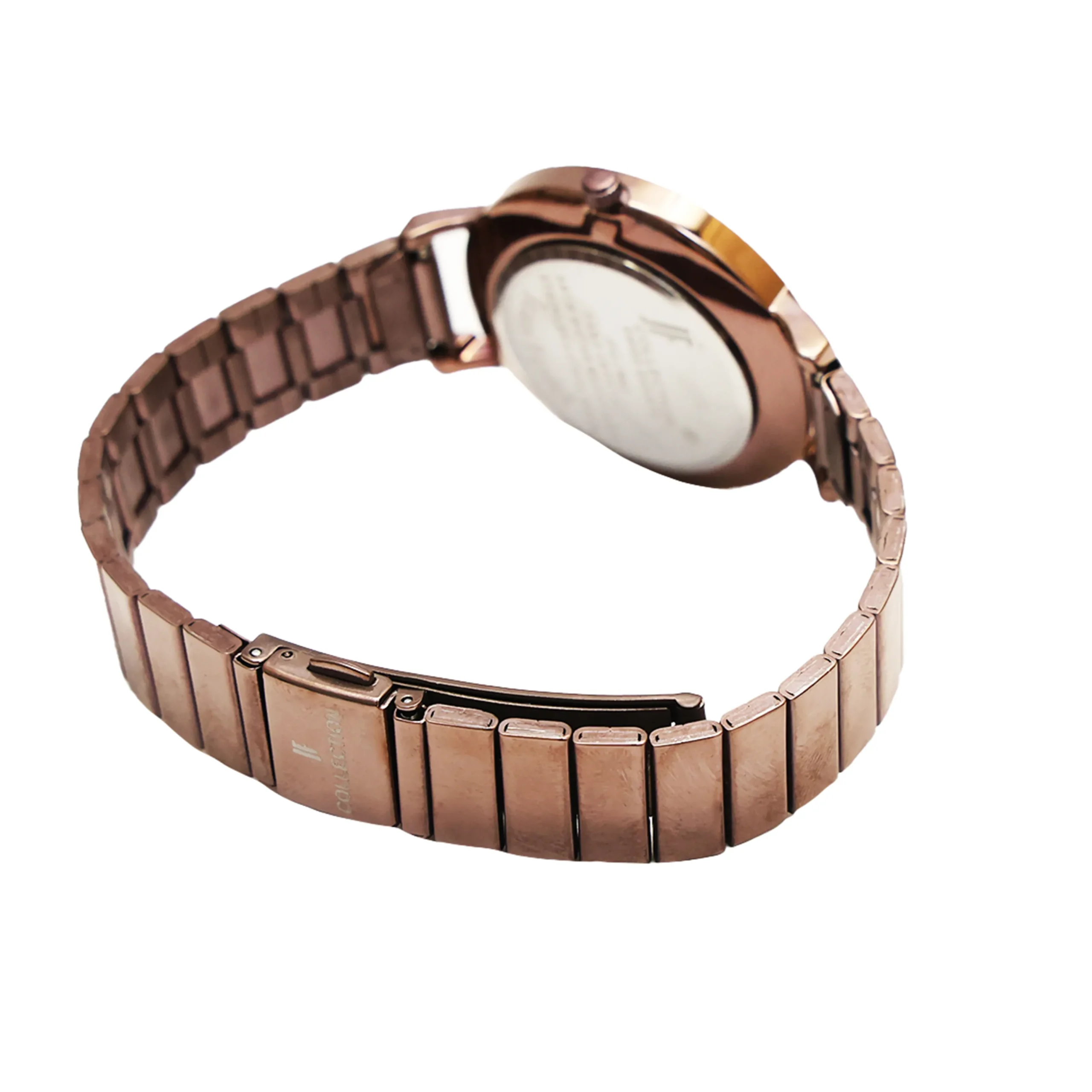Dial Color: Silver-white with sunburst finish Dial Pattern: Concentric circular sunburst texture Hour Markers: Minimalist without traditional indices Hands: Rose gold-tone slim hands (hour, minute, seconds) Brand Logo: “JF COLLECTION” printed at 12 o’clock position Dial Size: Clean, uncluttered layout Finishing: Radial sunburst pattern creating depth and visual interest
