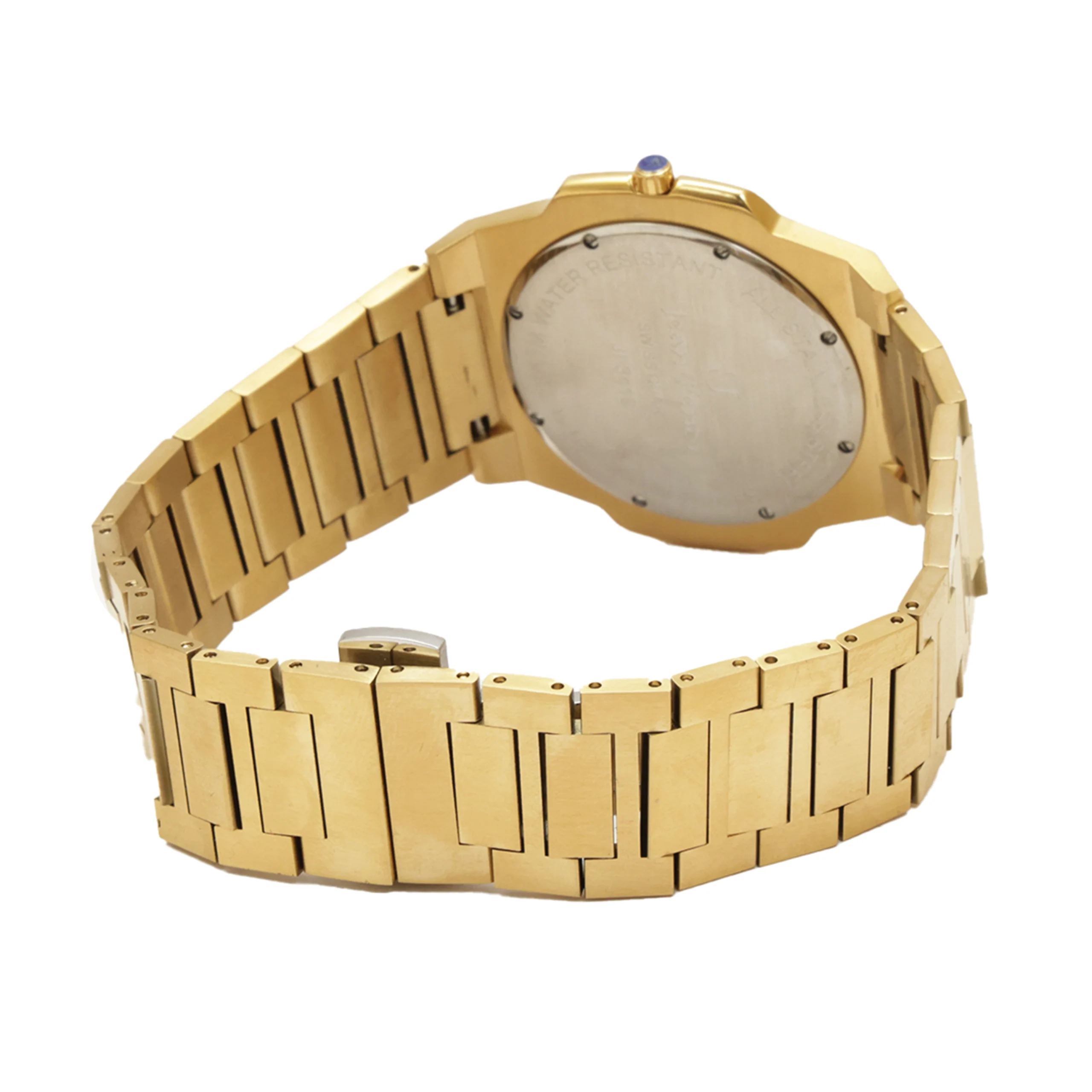 Material: Gold-plated stainless steel Diameter: 41mm Shape: Octagonal bezel with round dial Finish: Brushed gold with polished edges Crystal: Scratch-resistant sapphire crystal Crown: Fluted gold-tone crown