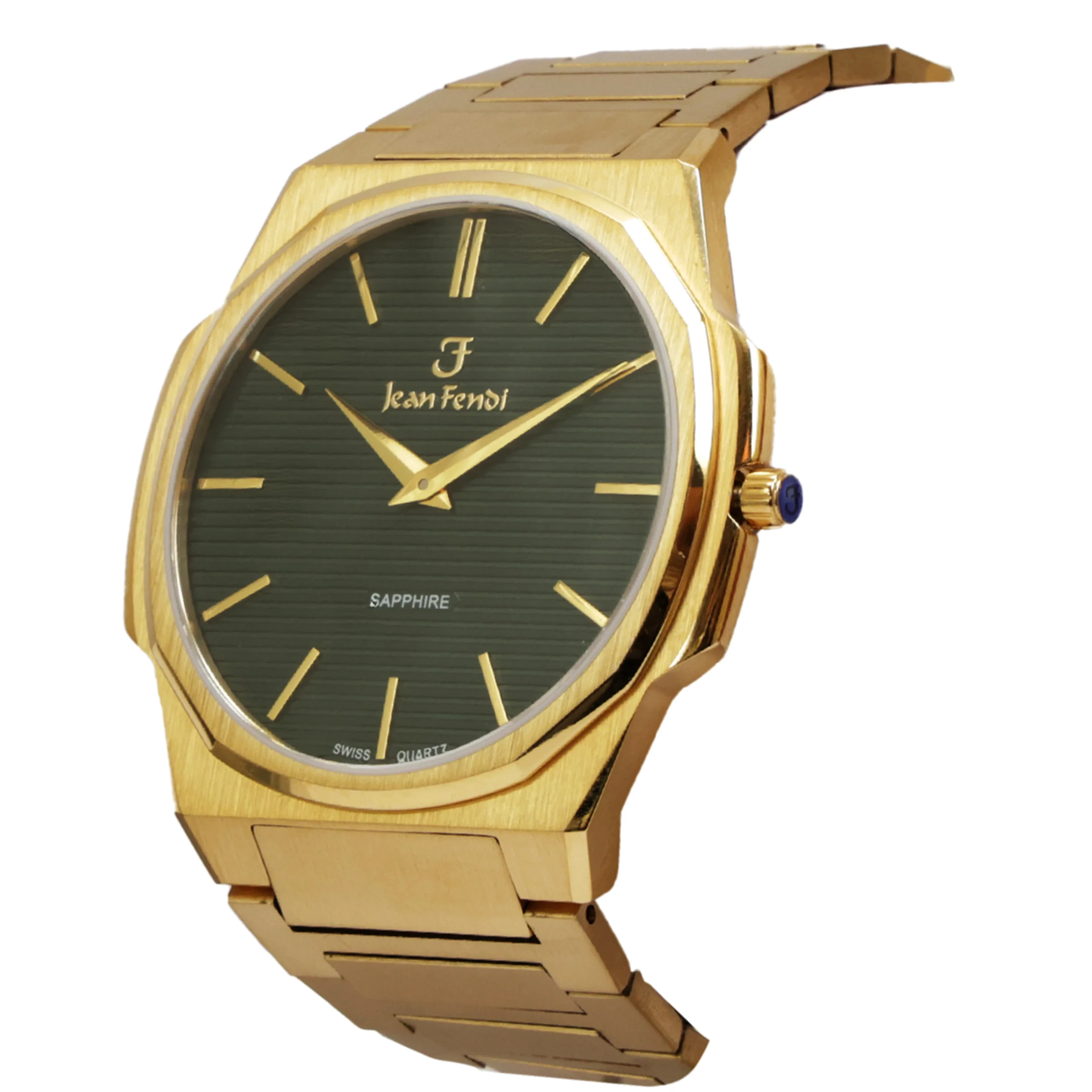 Color: Black with horizontal line texture Markers: Gold-tone baton indices Hands: Gold-tone with luminous accents Branding: Jean Fendi logo at 12 o’clock with “Sapphire” marking