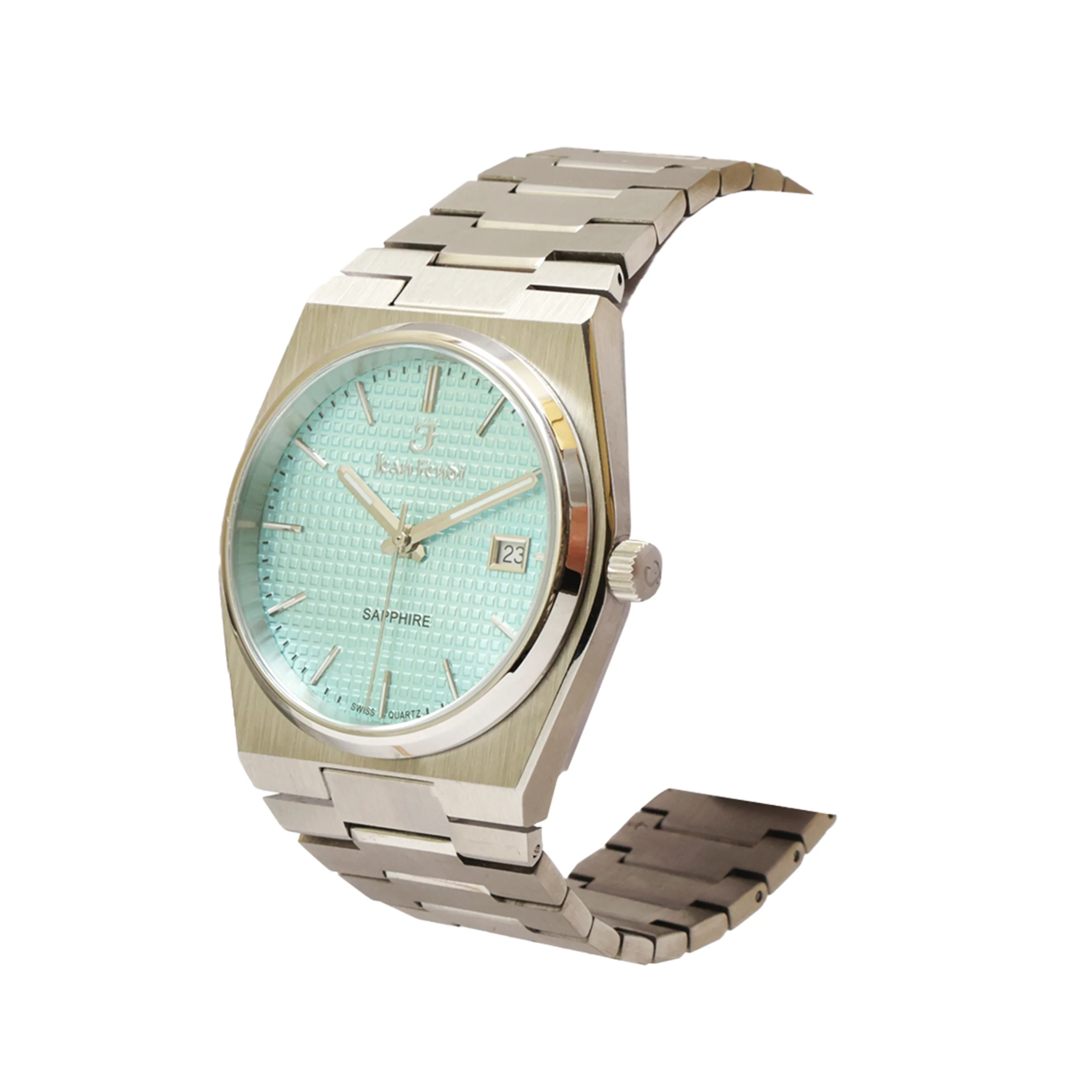 • Color: Aqua-blue textured grid pattern • Markers: Silver-tone baton indices • Hands: Silver-tone with luminous inserts • Date Display: Positioned at 3 o’clock • Branding: Jean Fendi logo at 12 o’clock with “Sapphire” marking