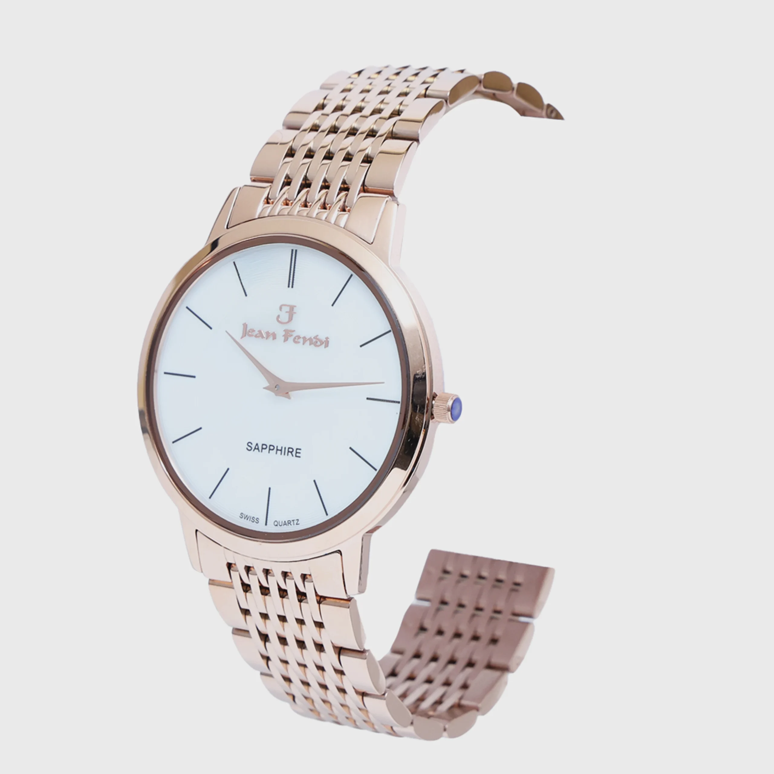 The Jean Fendi Sapphire White Dial Rose-Gold Men’s Watch offers understated elegance. Its crisp white dial contrasts beautifully with the warm rose-gold case and bracelet. Built with sapphire glass for unmatched durability and powered by Swiss quartz, this watch is perfect for daily wear with a touch of sophistication.