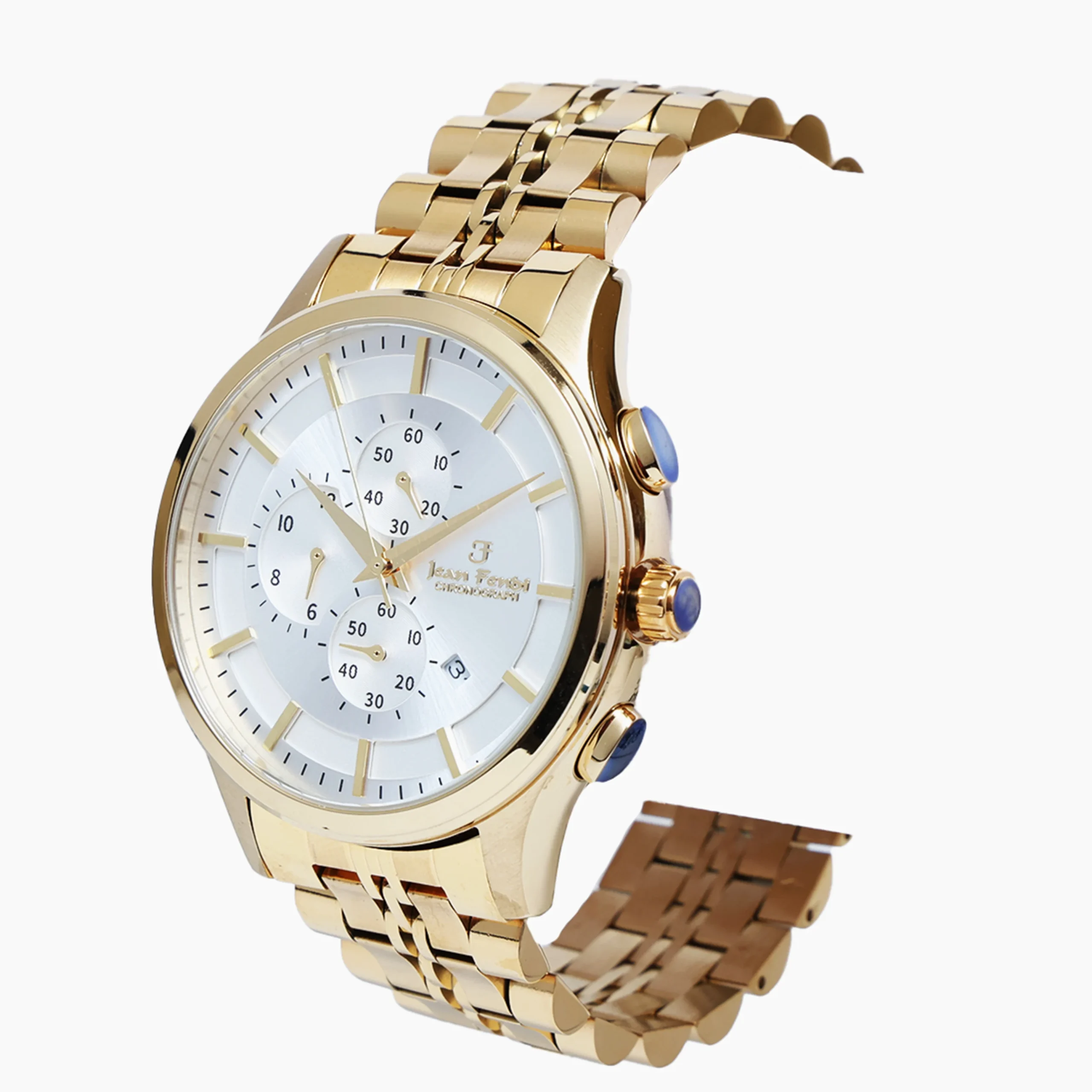 The Jean Fendi Silver Dial Gold Chronograph Men’s Watch is a timeless masterpiece that blends elegance with precision. Featuring a polished gold stainless steel bracelet and a striking silver dial with detailed chronograph sub-dials, this watch is built for men who value both luxury and performance. Its refined design makes it a perfect choice for formal occasions, business attire, or upscale evening wear.