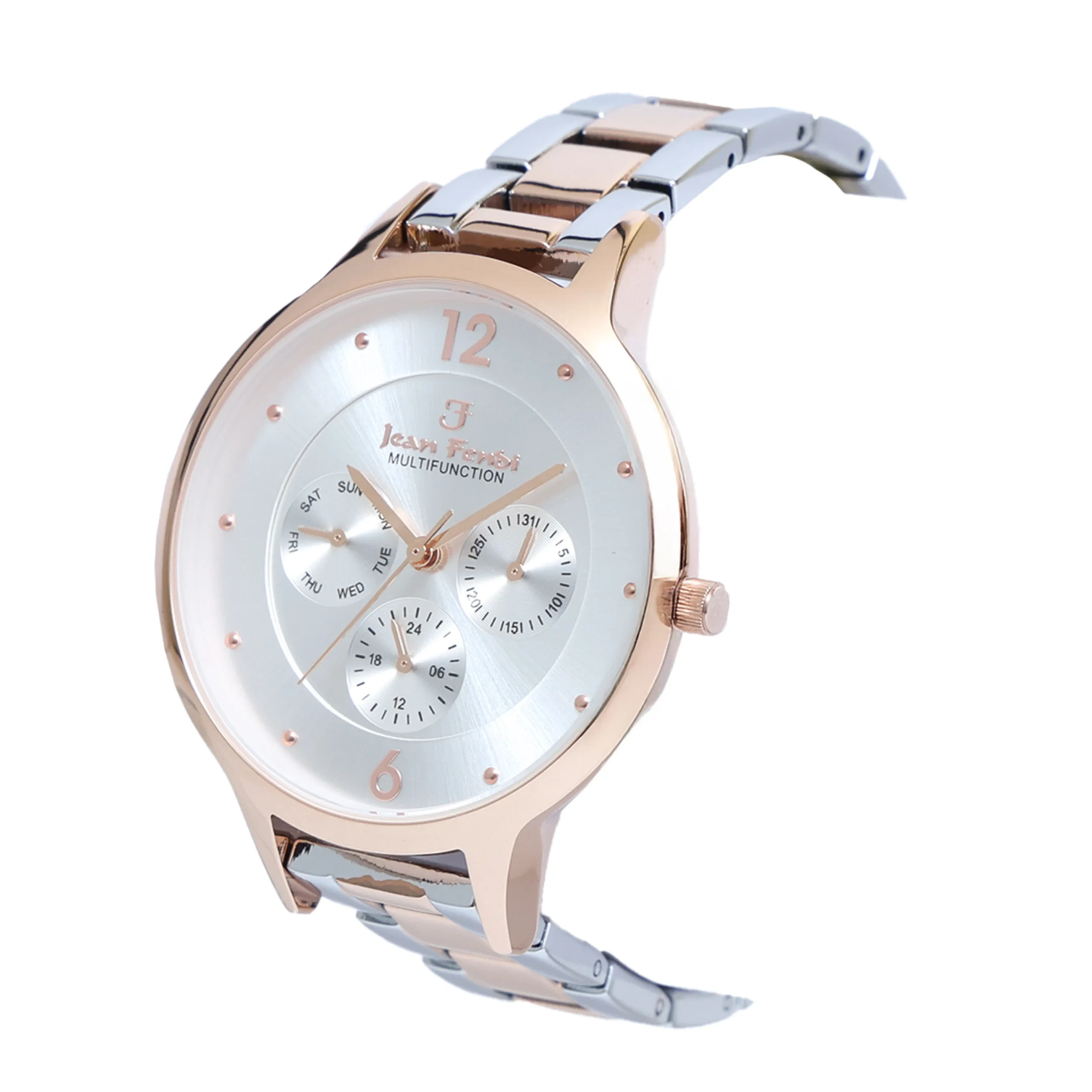 The Jean Fendi Silver Dial Rose-Gold Two-Tone Multifunction Ladies’ Watch is crafted for women who value timeless elegance with a modern touch. The radiant silver dial beautifully complements the chic two-tone bracelet of rose-gold and polished steel, creating a refined yet versatile accessory. With multifunction subdials that display the day, date, and 24-hour time, this timepiece blends feminine style with everyday practicality, making it perfect for work, events, and casual outings.