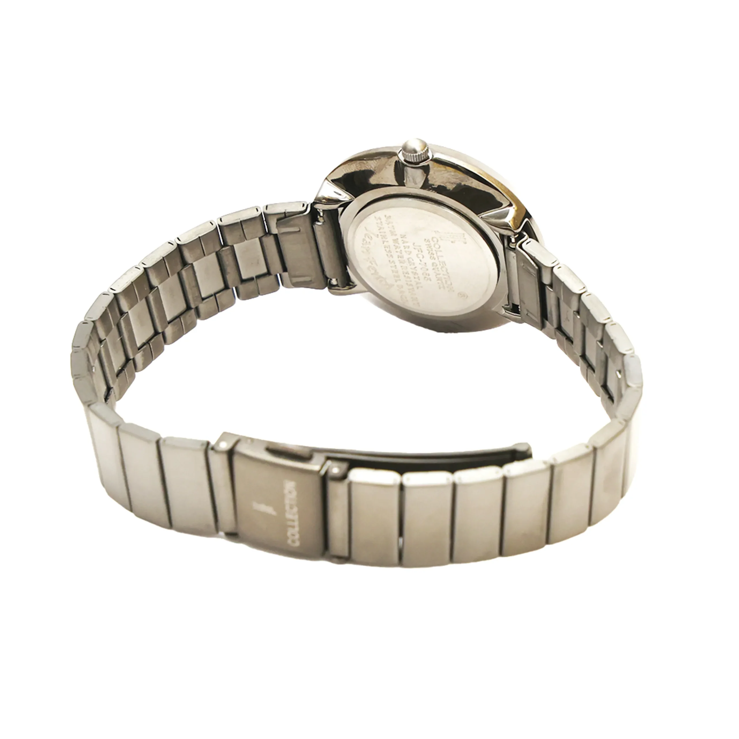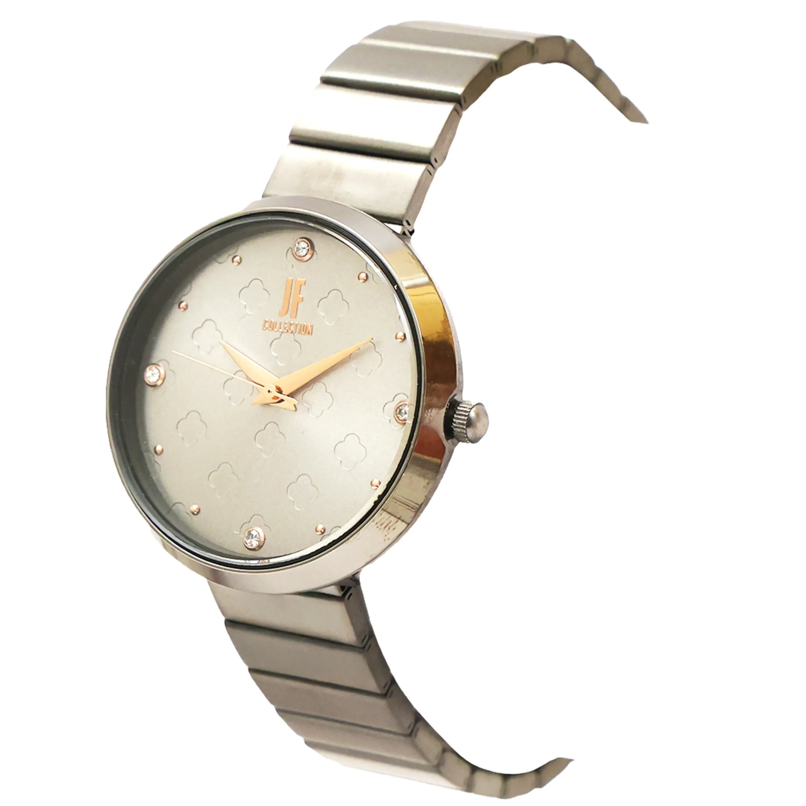 Color: Radiant Silver Sunray Dial Pattern: Quatrefoil Embossed Pattern Markers: Crystal Accents at 12, 3, 6 & 9 o’clock Other Indices: Rose-Gold Dot Markers Hands: Slim Rose-Gold Tone Hands Branding: JF Collection Logo at 12 o’clock