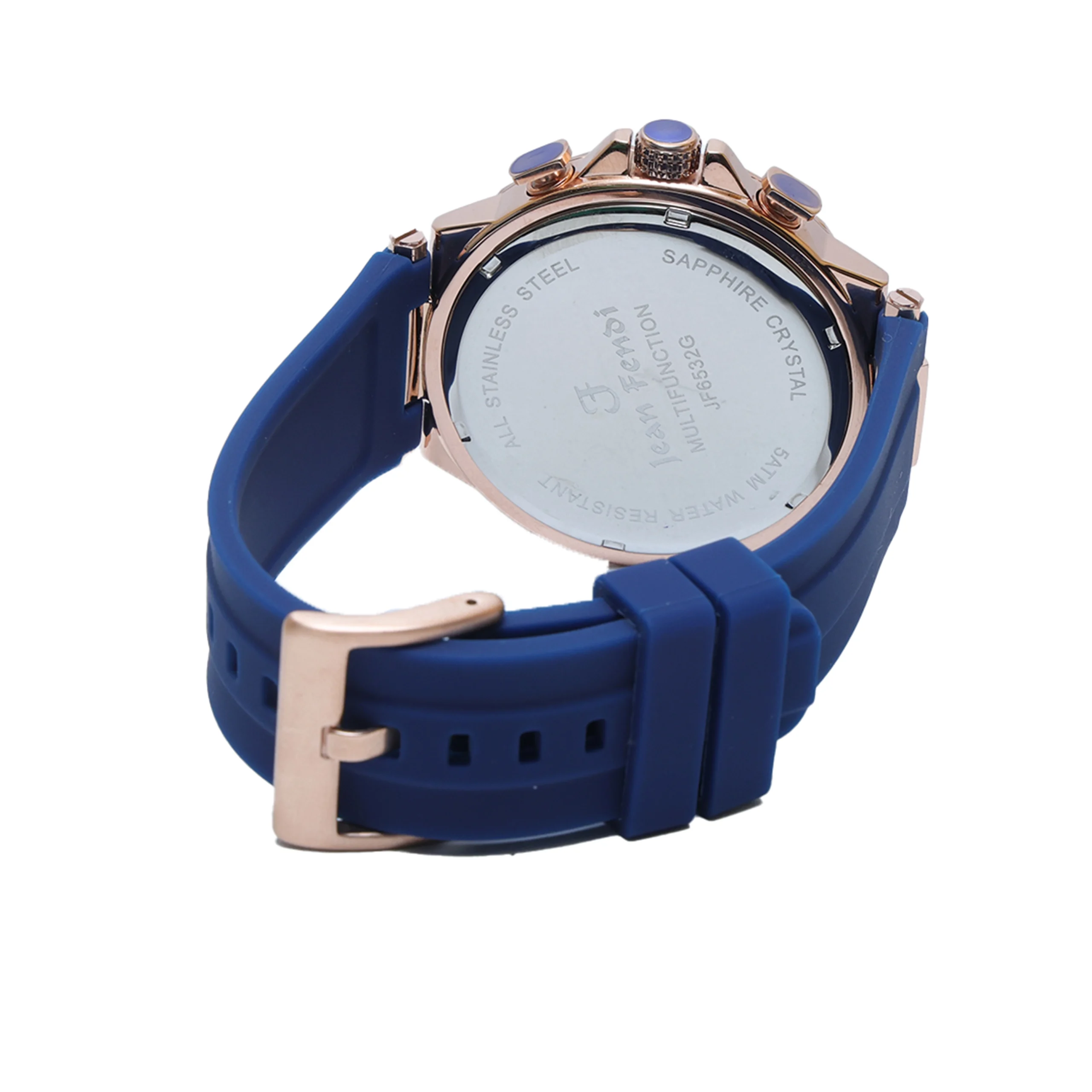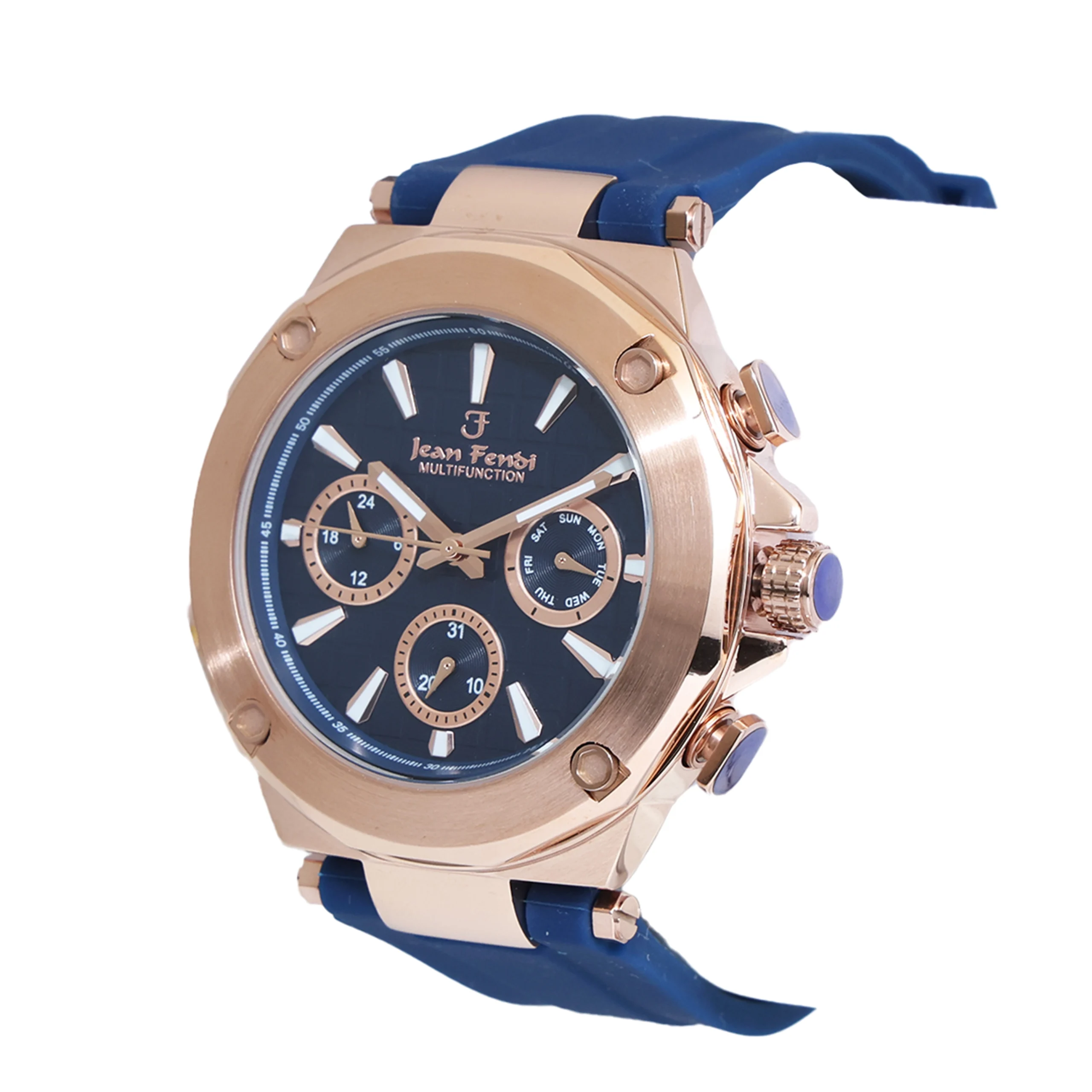 Dial Color: Blue Dial Texture: Subtle grid pattern Markers: Rose-gold hour indices with silver-white accents Hands: Rose-gold hands with luminous detailing Sub-Dials: 24-Hour Time Indicator Day Indicator Date Pointer Sub-Dial Branding: Jean Fendi logo & “MULTIFUNCTION” marking at 12 o’clock